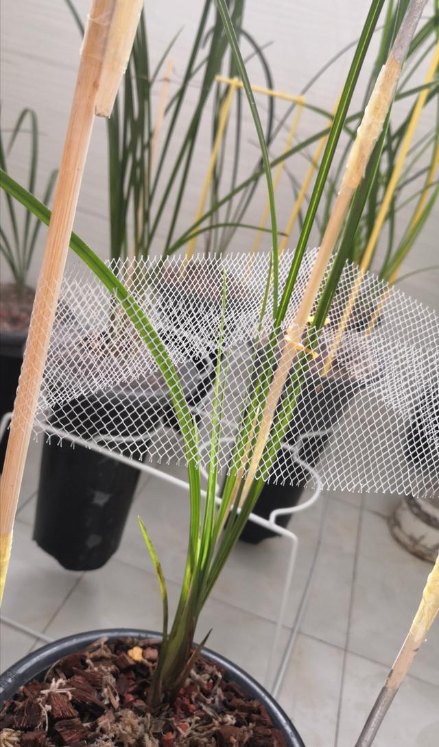 由于老苗叶片超高,即使加高的护叶架也无法起到支撑叶片的作用,彝乡兰缘不得不将三只一次性筷子接起来辅助支撑叶片,以免吹倒影响正常生长。